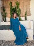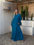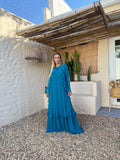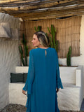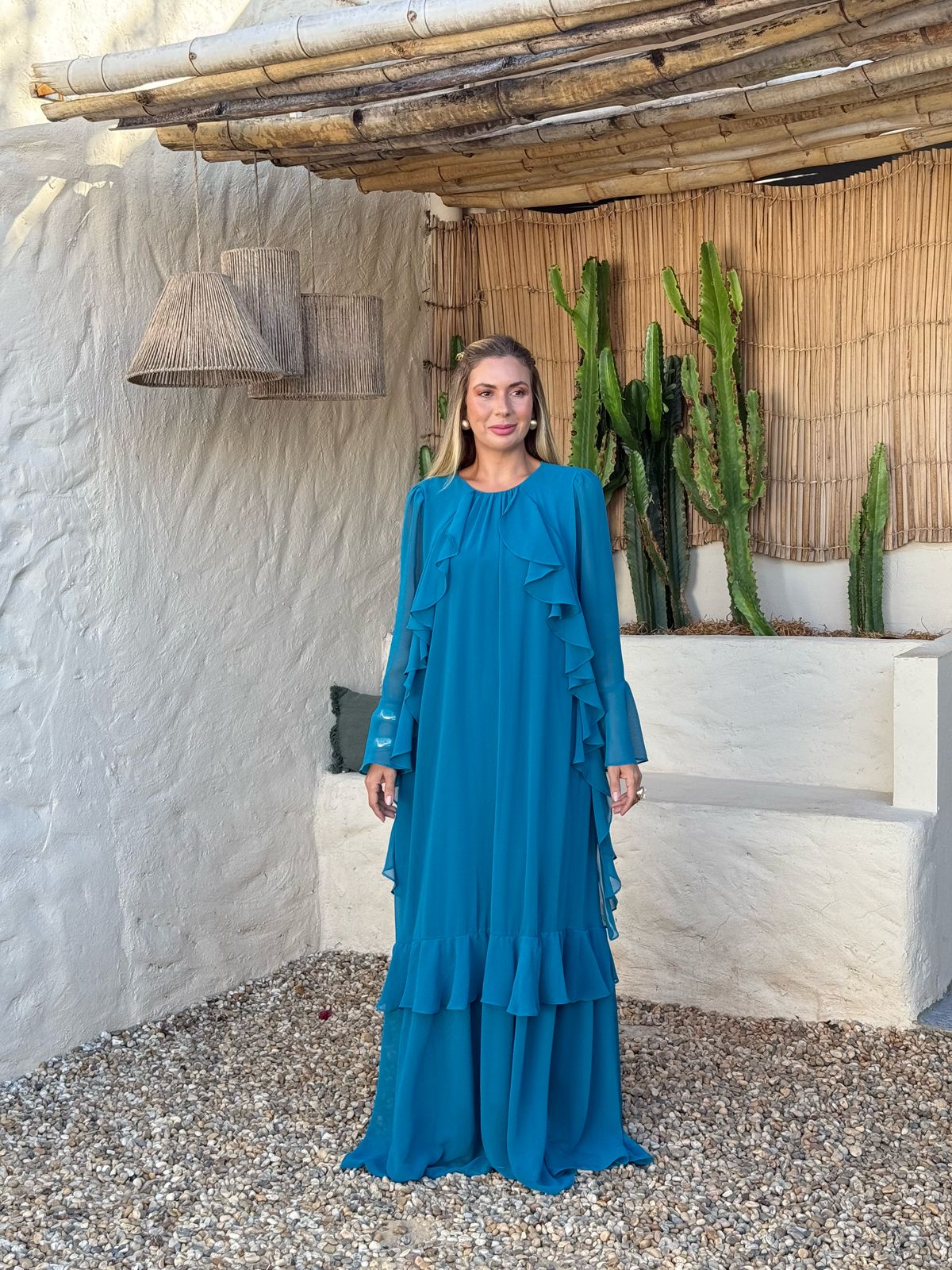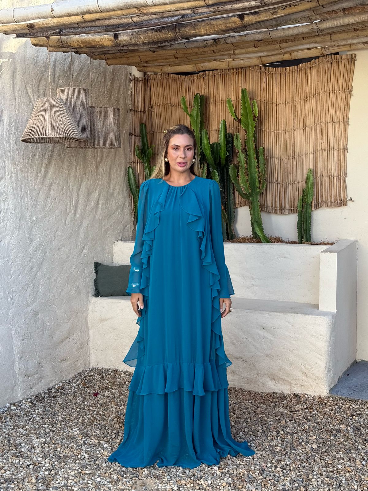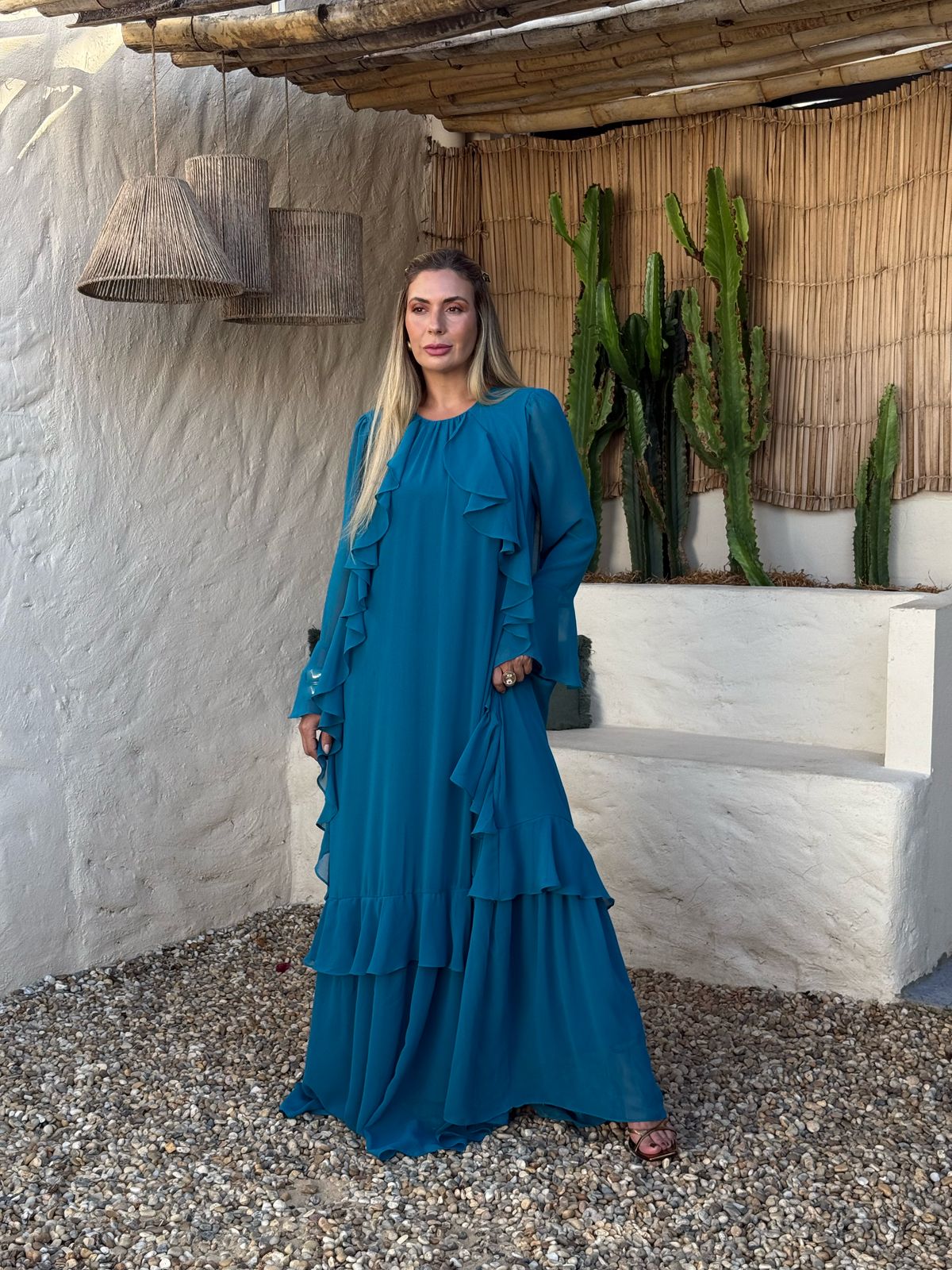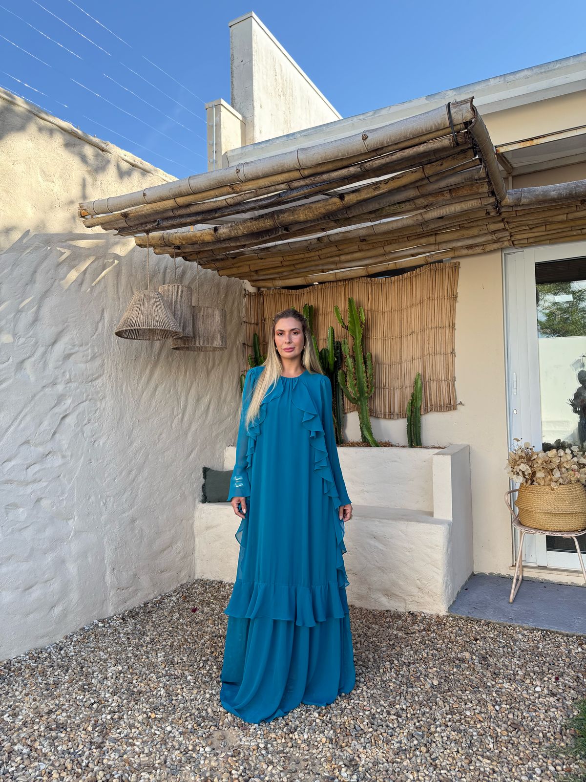 Vestido longo azul petróleo, um verdadeiro ícone de elegância e sofisticação. O crepe de seda liso cai suavemente ao longo do corpo, criando uma silhueta feminina e graciosa. O azul petróleo é um tom único e sofisticado, perfeito para quem busca um look chic e glamour. O vestido é ideal para ocasiões especiais, como casamentos, festas de gala ou jantares elegantes. A seda de alta qualidade e o corte impecável tornam este vestido um verdadeiro investimento para qualquer guarda-roupa.